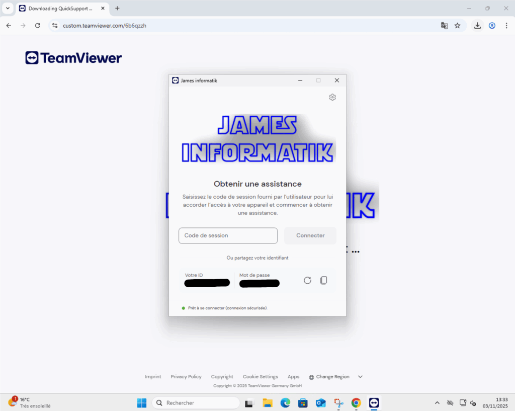 Dans la fenètre qui apparait comme ci-dessous vous allez obtenir un ID et un code de session qui nous permettront de prendre la main à distance afin d’effectuer les opérations nécessaires.
